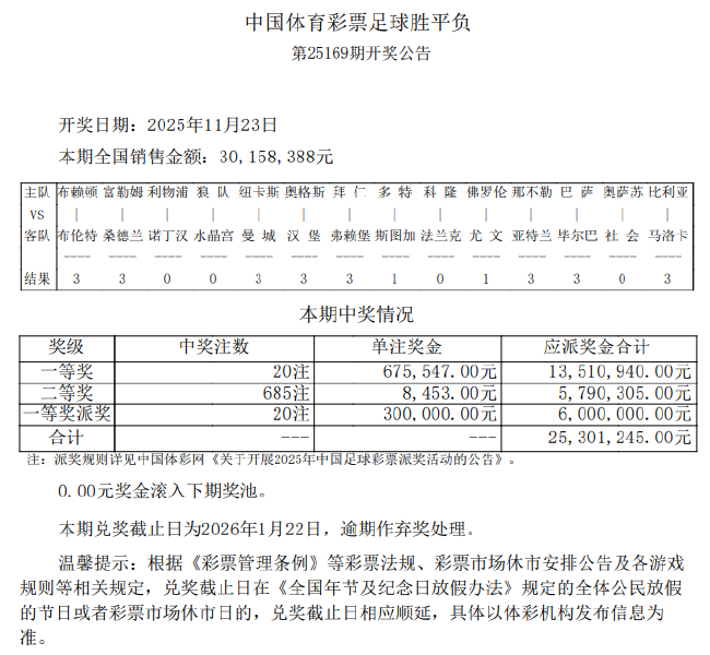 诺丁汉森林客场3-0利物浦北京时间11月23日,足彩第25169期开奖结果揭晓。足彩派奖首期头奖开出20注,单注奖金675,547元,本期600万派奖奖金全部派完,每注多得300,000元,单注共计9